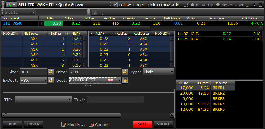 Traders can choose to enable IOI panel directly in TMS market depth. IOI panel will allow traders to view IOIs related to selected instrument and initiate trader against actionable IOIs with the click of a mouse.