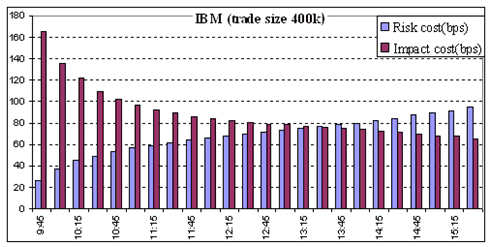 For example, the chart below superimposes cost impact which is getting smaller as trading spreads over a longer period of time and risk of the instrument price deviation in unfavorable direction as the time interval gets greater:
