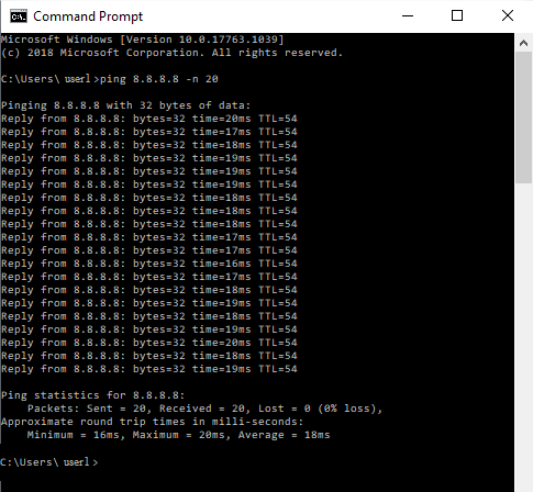 Ping statistics for 8.8.8.8: Packets: Sent = 20, Received = 20, Lost = 0 (0% loss), Approximate round trip times in milli-seconds: Minimum = 16ms, Maximum = 20ms, Average = 18msThe number of lost packets should be low, preferably 0. Round trip time should be low and stable, preferably below 40ms (60-80ms is acceptable). If you see times above 80ms or a huge dispersion (like more than tens of ms between the minimum and maximum) something may be wrong with your internet connection. You should reach out to your ISP for a diagnosis or an upgrade.